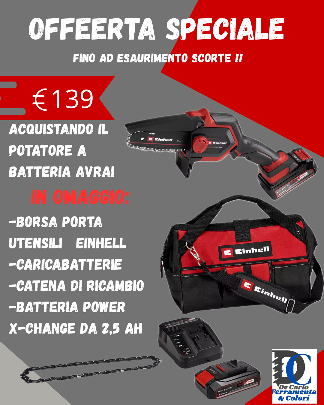 La motosega da potatura a batteria GE-PS 18/15 Li Bag Kit di Einhell è un pratico aiutante per la potatura e la sagomatura di alberi e arbusti, nonché per la sminuzzatura di sfalci verdi e il taglio di legname più piccolo e squadrato. La sega compatta fa parte della famiglia Power X-Change di Einhell e può essere combinata con tutte le batterie e i caricabatteria della famiglia. L'apparecchio è alimentato da un motore Brushless di Einhell. Il motore senza spazzole offre più potenza e una maggiore autonomia di lavoro rispetto ai tradizionali motori a spazzole a carboncino ,Con una lunghezza della lama di 15,8 cm e una lunghezza di taglio di 12,5 cm, questa piccola e leggera motosega a batteria è ideale per un uso versatile in giardino. Il motore ad alta efficienza garantisce vibrazioni minime e una velocità della catena fino a 4,8 m/s. La sega viene fornita con un set di lame e catene di alta qualità per elevate prestazioni di taglio e i migliori risultati di lavoro. Per una facile manutenzione, la barra e la catena possono essere sostituite facilmente e senza attrezzi. La sega è dotata di una protezione per le mani e di un copricatena pieghevole che ne rendono l'uso sicuro e versatile. Il pratico attrezzo da giardino è comodo da tenere in mano grazie all'impugnatura sottile, alle speciali superfici Softgrip e al poggiamani incorporato per l'uso ambidestro. Consegnata con copertura per riporre in modo sicuro la piccola motosega. Sono inclusi anche un dosatore per l'oliatura manuale della catena e una chiave a brugola per il tensionamento della catena. Il set comprende anche una batteria Power X-Change da 2,5 Ah, un caricabatteria, una catena di ricambio per la sostituzione rapida della catena e la Einhell Bag 45/29.