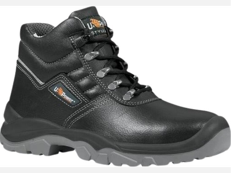 Scarpe antinfortunistiche alte, classiche e robuste U-Power della linea Style&Job, con tomaia in pelle stampata idrorepellente, puntale in acciaio, antiperforazione, antiscivolo, lamina in acciaio ergonomica e suola PU/PU, RS S3 SRC